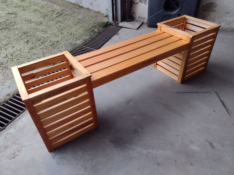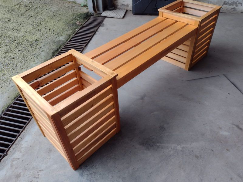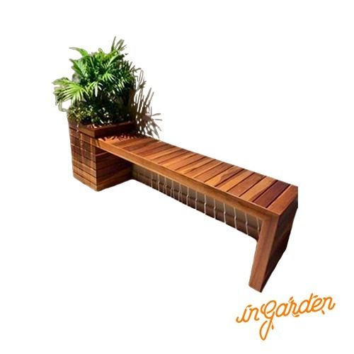 Os bancos de madeira com floreira em grápia são uma adição encantadora para qualquer espaço, oferecendo beleza natural e mais de 25 anos de durabilidade.